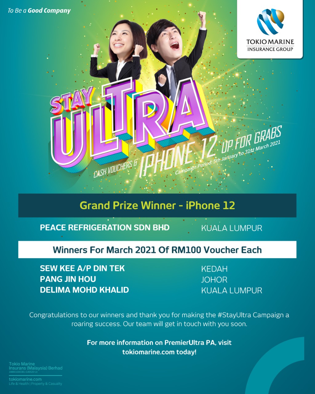 Tokio Marine Insurans (Malaysia) Berhad (TMIM) would like to thank everyone who participated in the Tokio Marine PremierUltra PA #StayUltra Campaign. The campaign has garnered tremendous response and we are happy to announce the Grand Prize Winner of an iPhone 12 and final group of winners for the month of March 2021