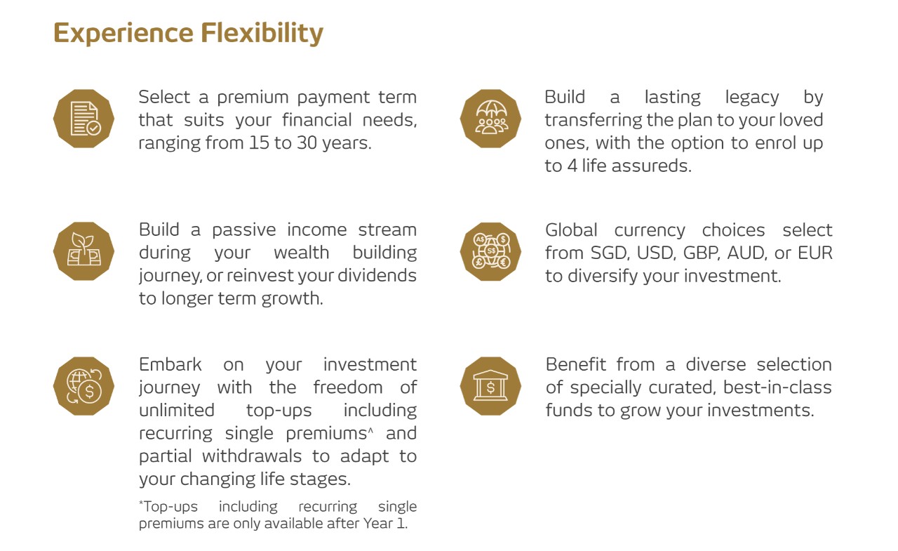 The plan caters to varying priorities and financial objectives, including those of individuals who are single, starting a family, planning for children’s education or individuals in mature life stages, as well as objectives such as wealth accumulation, retirement planning, legacy planning and protection.