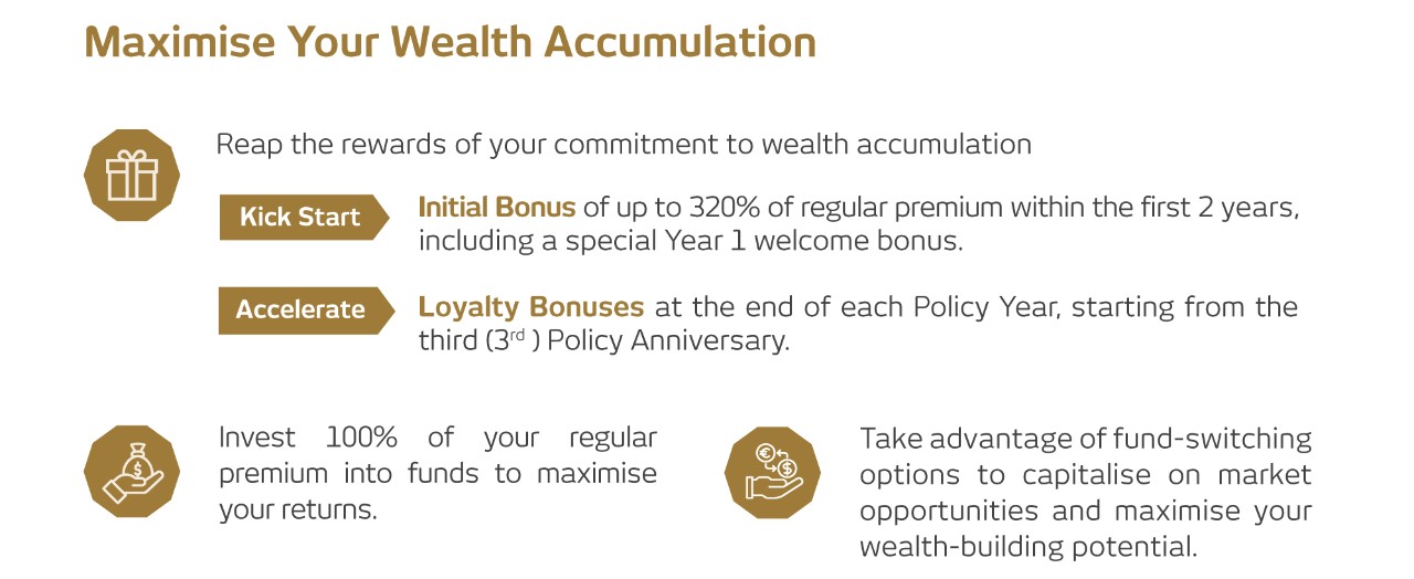 ✔ A limited premium investment-linked plan for wealth accumulation and long-term potential investment returns.