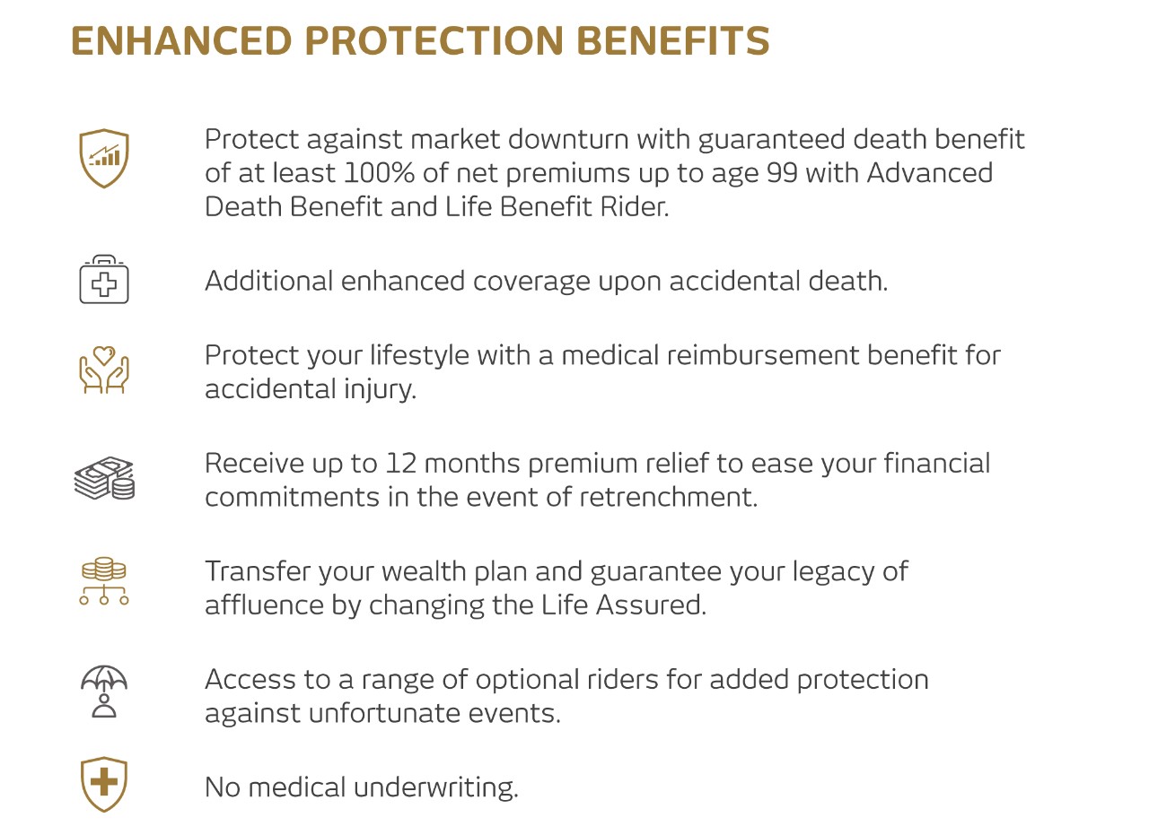 It is a limited-pay, whole life, investment-linked plan (ILP) that provides financially rewarding opportunities, enhanced protection benefits and financial flexibility that are tailored for you.