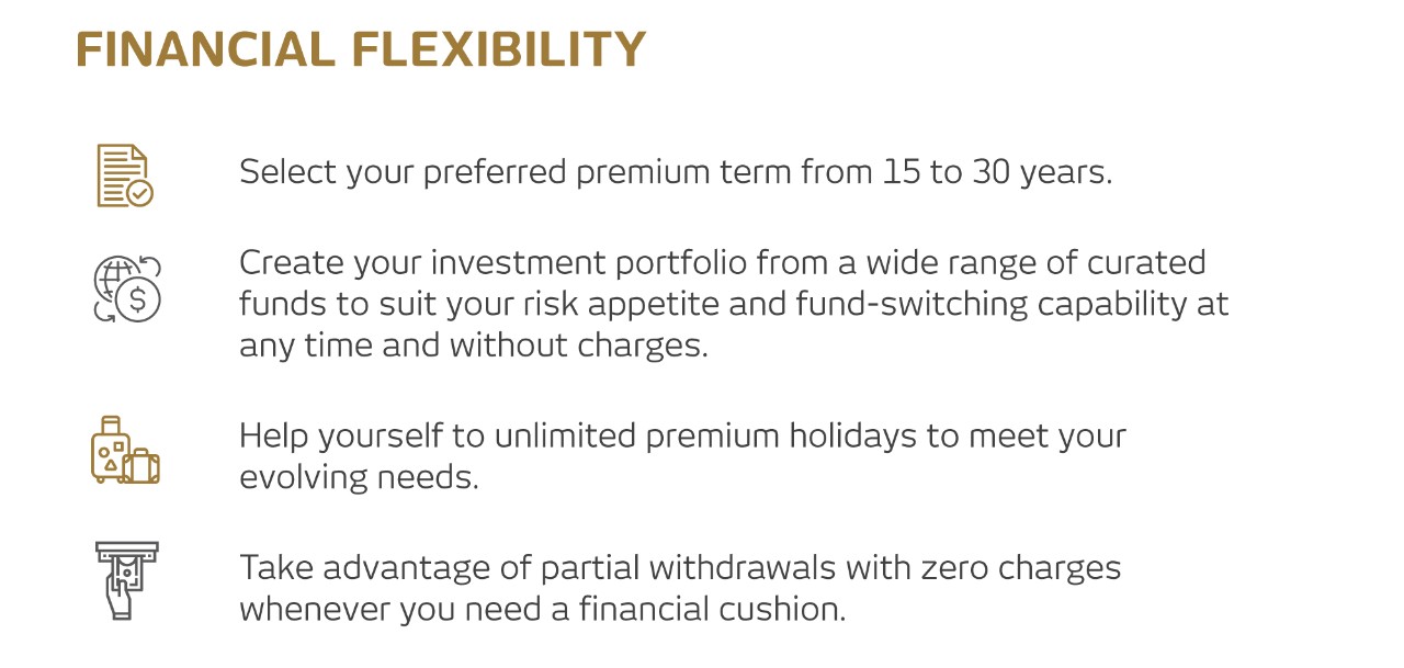 The plan caters to varying priorities and financial objectives, including those of individuals who are single, starting a family, planning for children’s education or individuals in mature life stages, as well as objectives such as wealth accumulation, retirement planning, legacy planning and protection.
