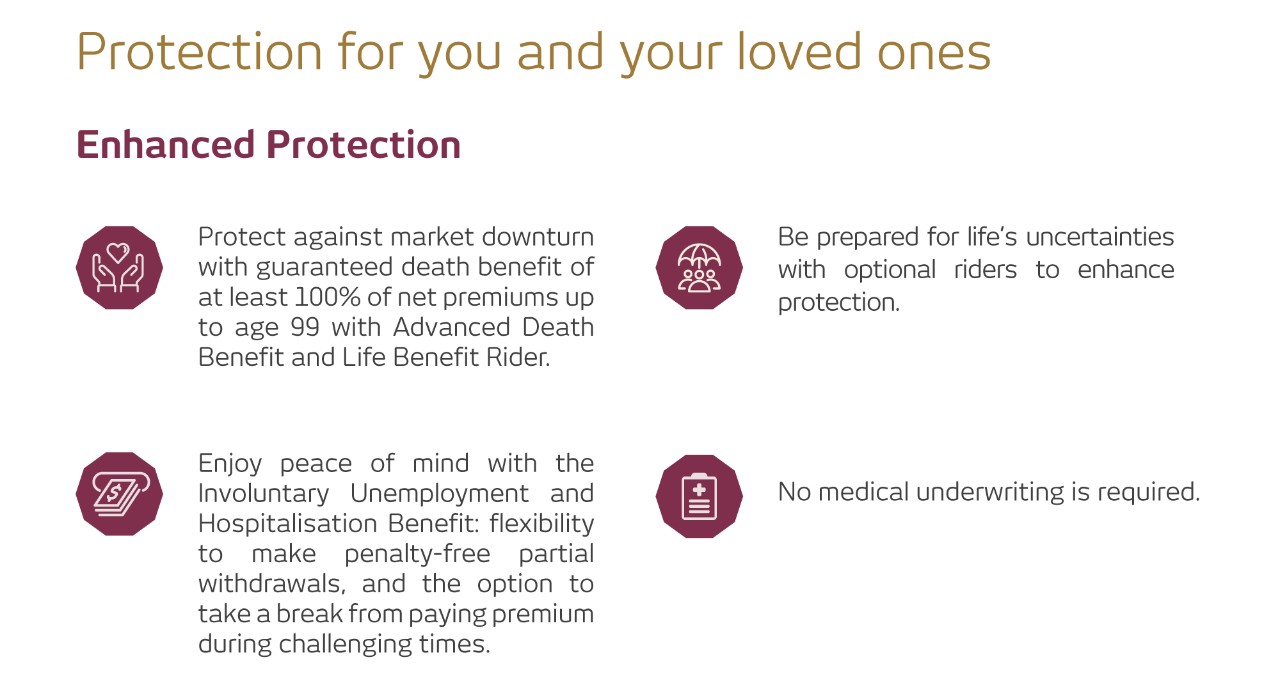 The plan caters to varying priorities and financial objectives, including those of individuals who are single, starting a family, planning for children’s education or individuals in mature life stages, as well as objectives such as wealth accumulation, retirement planning, legacy planning and protection.