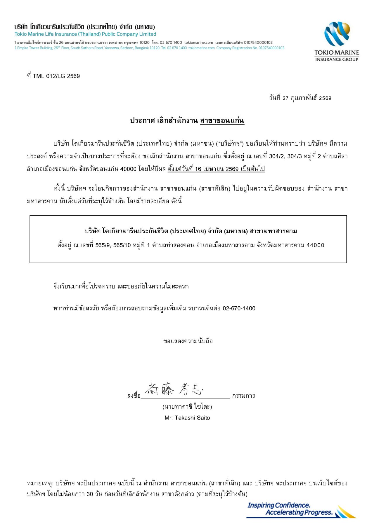 บริษัท โตเกียวมารีนประกันชีวิต (ประเทศไทย) จำกัด (มหาชน) ขอเรียนให้ท่านทราบว่า บริษัทฯ มีความประสงค์ หรือความจำเป็นบางประการที่จะต้อง ขอเลิกสำนักงาน สาขาขอนแก่น ซึ่งตั้งอยู่ ณ เลขที่ 304/2, 304/3 หมู่ที่ 2 ตำบลศิลา อำเภอเมืองขอนแก่น จังหวัดขอนแก่น 40000 โดยให้มีผล ตั้งแต่วันที่ 16 เมษายน 2569 เป็นต้นไป