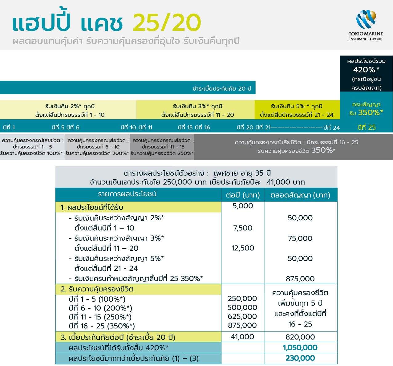 • ชำระเบี้ยประกันภัย 20 ปี ระยะเวลาคุ้มครอง 25 ปี