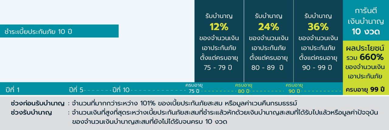 แบบประกันภัยบำนาญ เริ่มรับเงินบำนาญเมื่อครบอายุ 75 ปี การันตีผลประโยชน์ตลอดสัญญาสูงถึง 660% ของจำนวนเงินเอาประกันภัย สมัครง่าย ไม่ต้องตรวจและไม่ต้องตอบคำถามสุขภาพ